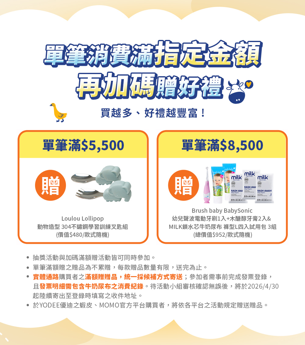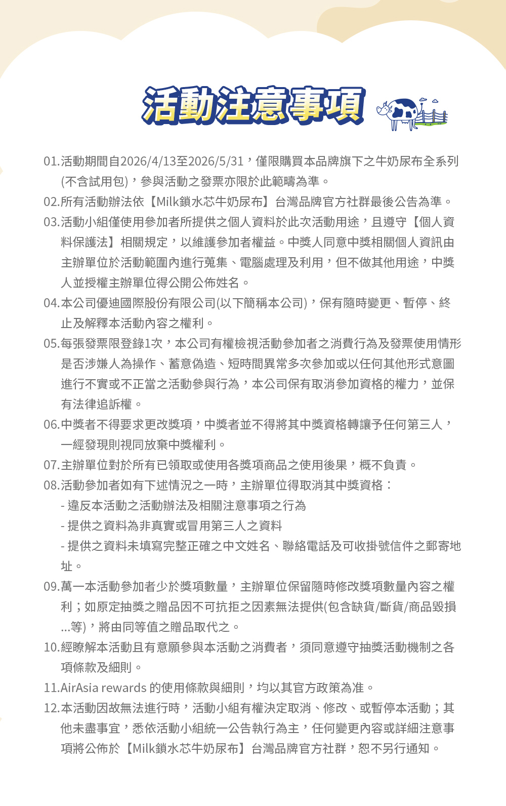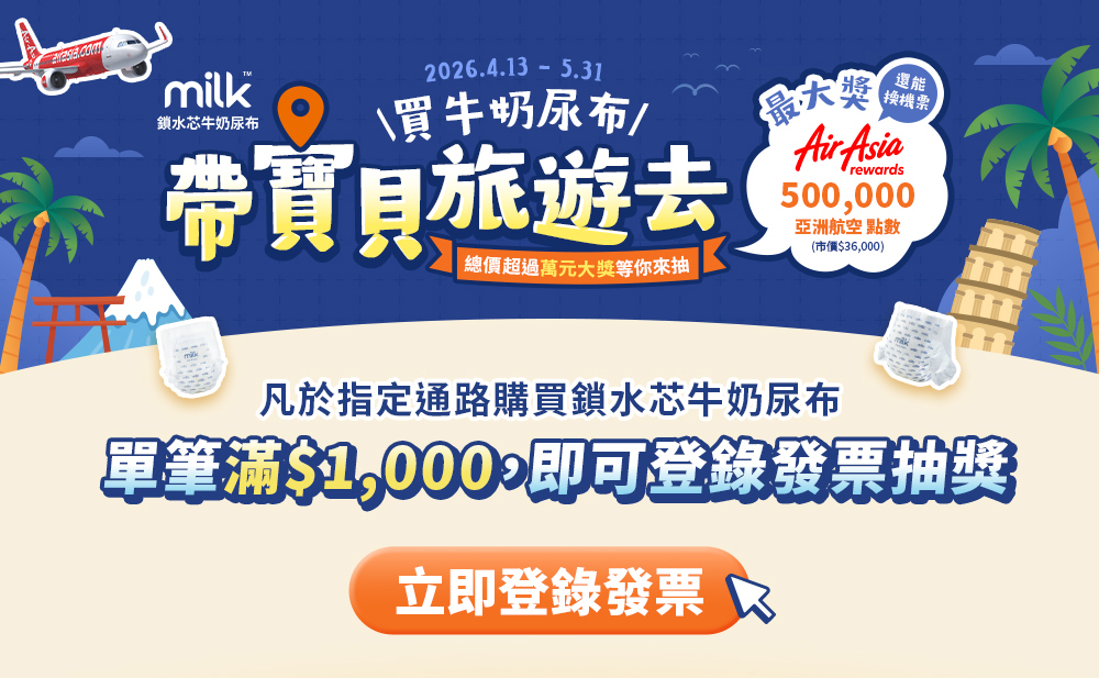 買MILK牛奶尿布 「滿千即可登錄發票」最大獎抽亞洲航空50萬點數!