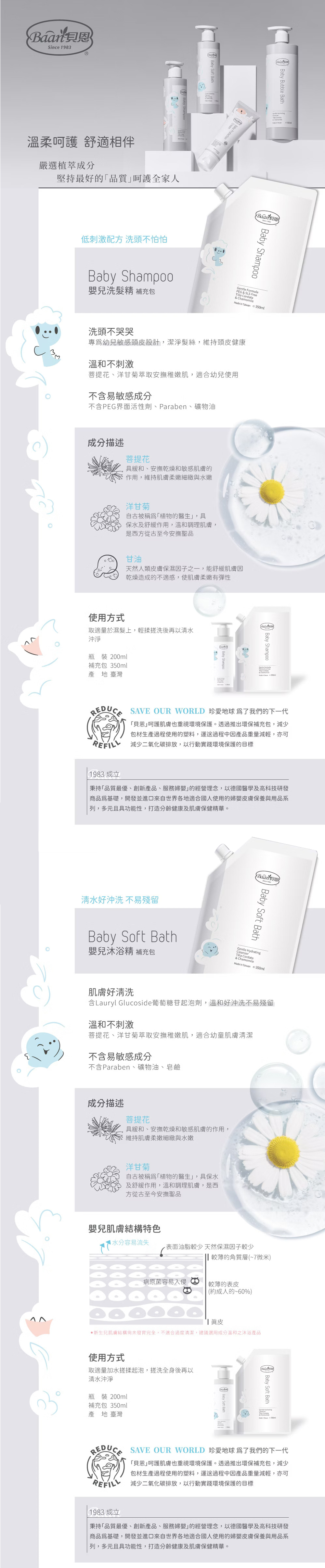 |Baan貝恩 嬰兒沐浴精補充包350ml+嬰兒洗髮精補充包350ml|