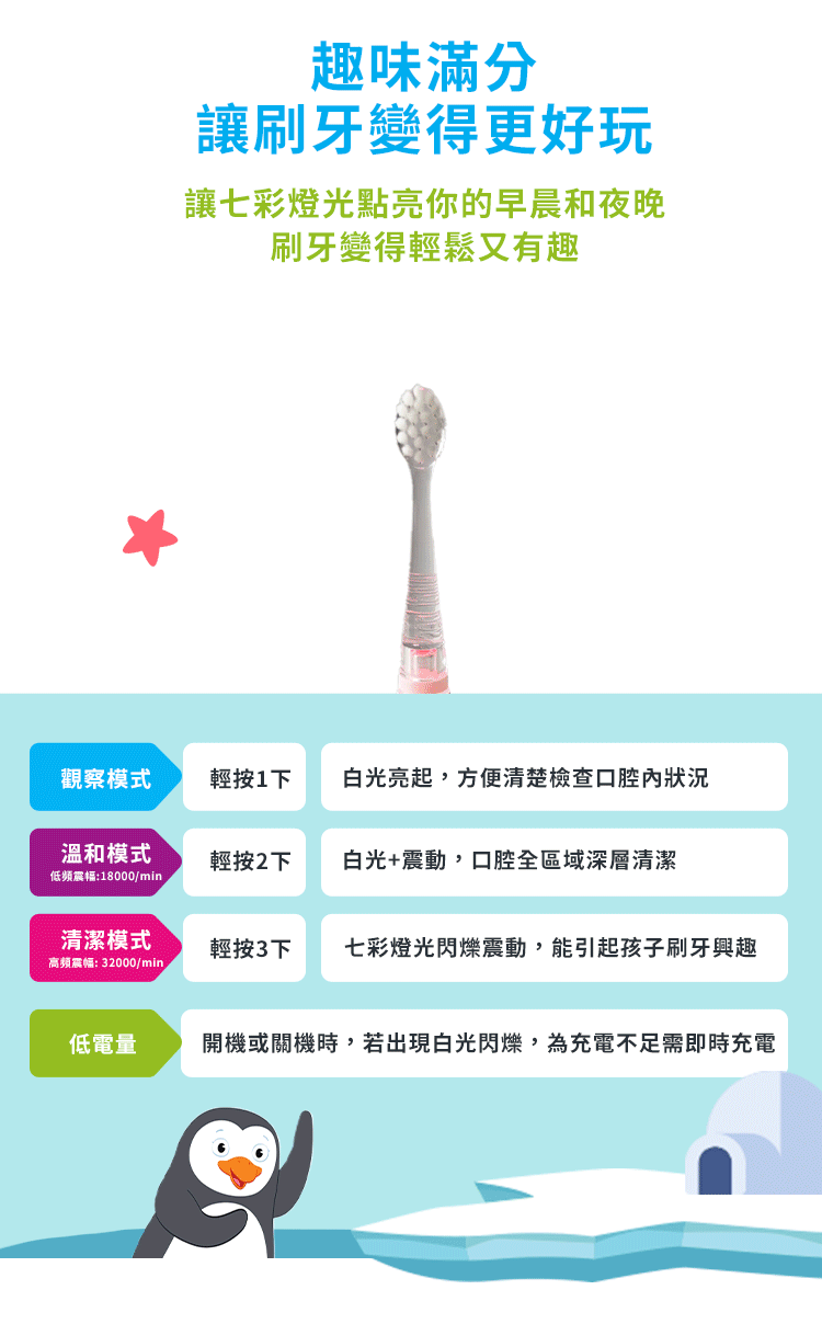 2.此電動牙刷需由父母親陪同或輔助刷牙動作,以減少未能正確潔淨牙齒而造成蛀牙。