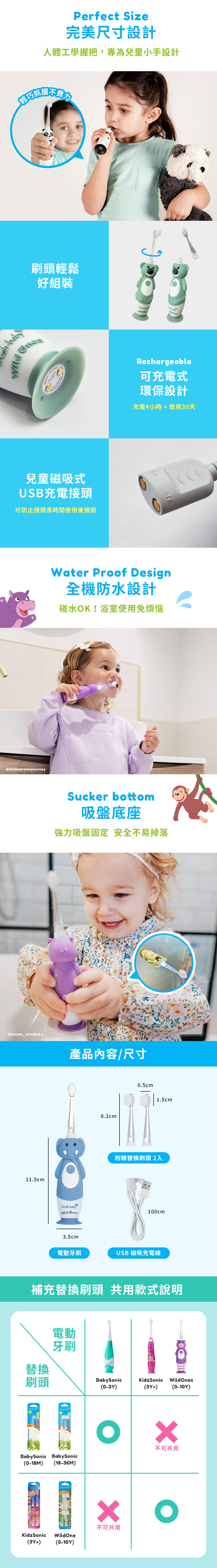2.KidzSonic(3歲以上)、WildOnes(0-10歲)的2款刷頭可在電動牙刷上共用。