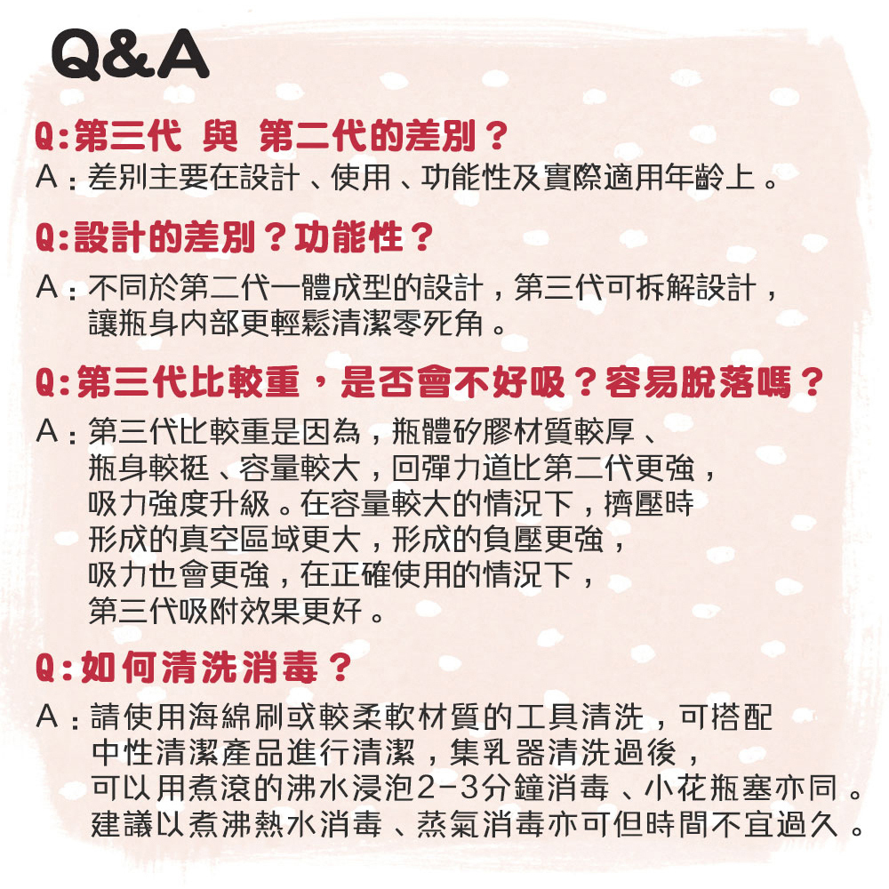 使用方式:先將瓶中的空氣壓出,然後放開、輕輕吸附在乳房上即可,吸附之後媽咪可以不用手持做自己的事