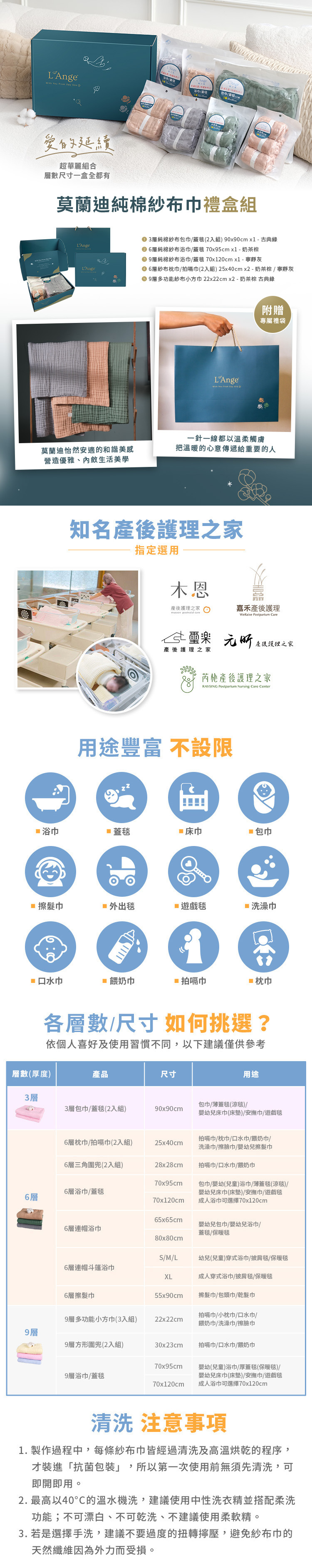 紗布巾洗滌方式:以溫水機器輕柔洗滌,低溫旋轉烘乾,不可熨燙、乾洗、漂白。