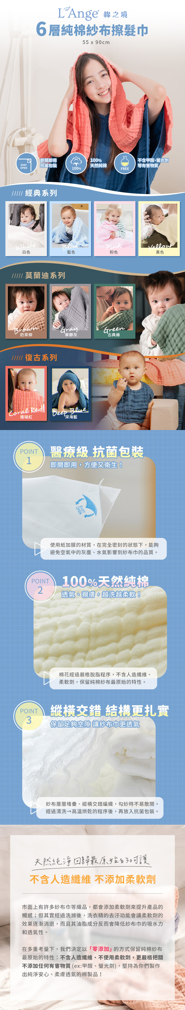 嚴選棉花及脫脂程序,縱橫交錯編織而成,透氣、快乾且吸水性極佳!可快速帶走多餘水分,日常使用性極高。