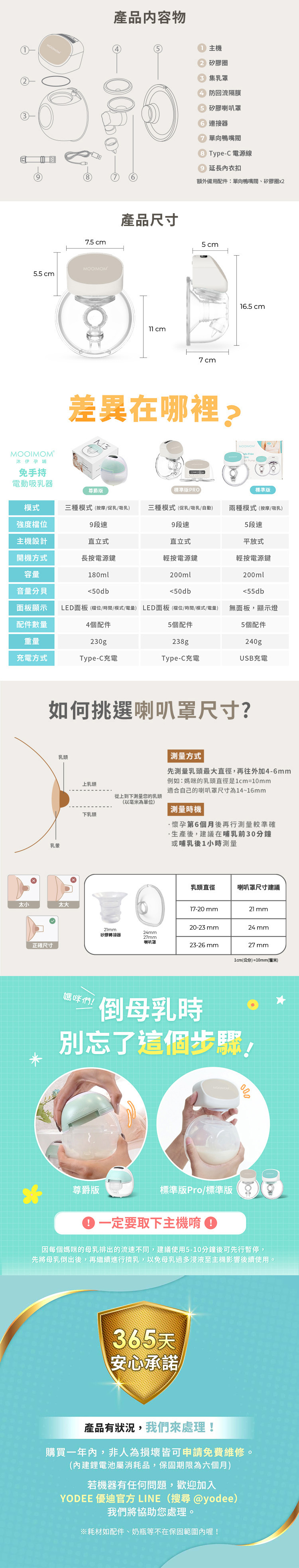 內容物:主機、Type-C電源線、矽膠喇叭罩24mm、矽膠防回流隔膜、單向鴨嘴閥、集乳罩、延長內衣扣、額外備用配件(單向鴨嘴閥x1﹑矽膠密封圈x2)