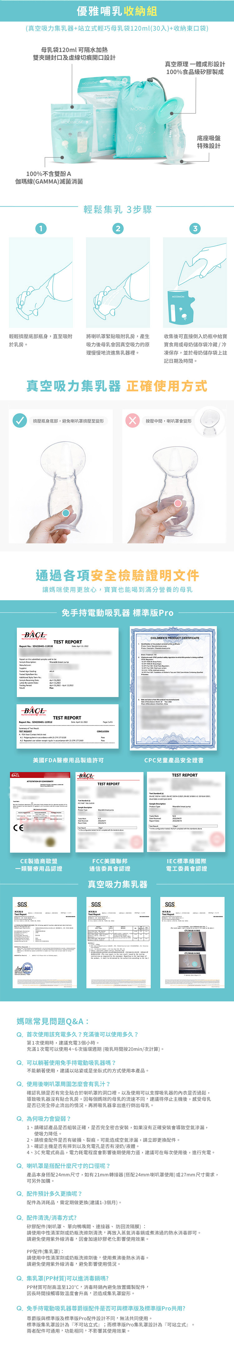 內容物:真空吸力集乳器、防塵蓋、使用說明書、站立式輕巧母乳袋120ml(30入)、收納束口袋