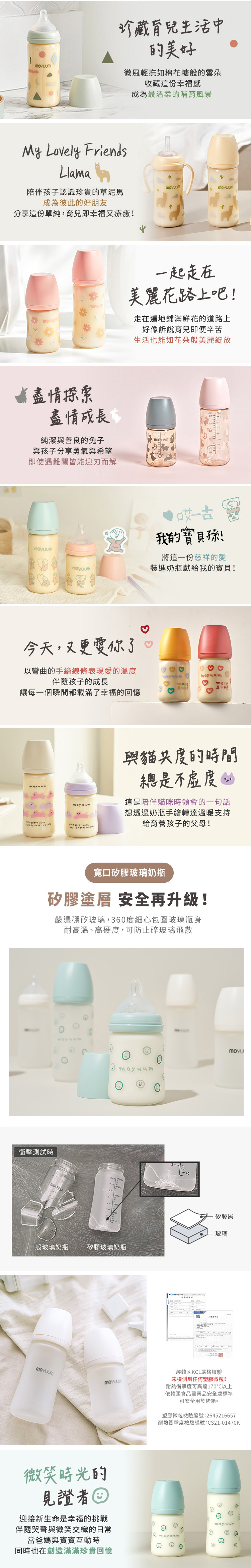 -透過360度矽膠層包覆瓶身,若奶瓶意外摔破時,可降低玻璃飛散的可能性,仍請家長務必小心使用。