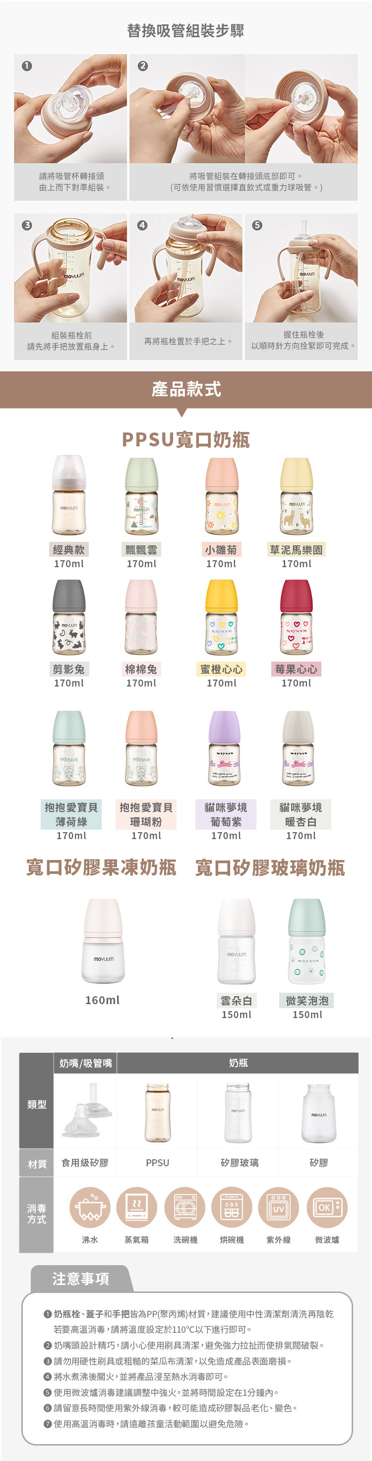 -奶嘴為消耗品,經消毒方式或使用習慣、頻率而變色,請視使用狀況建議3個月更換奶嘴;6個月更換奶瓶。
