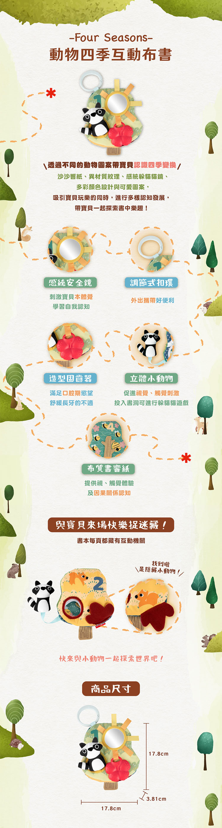 -含豐富的色彩圖案,包括四季變化設計、森林小夥伴、數字,可透過親子共讀互動及學習