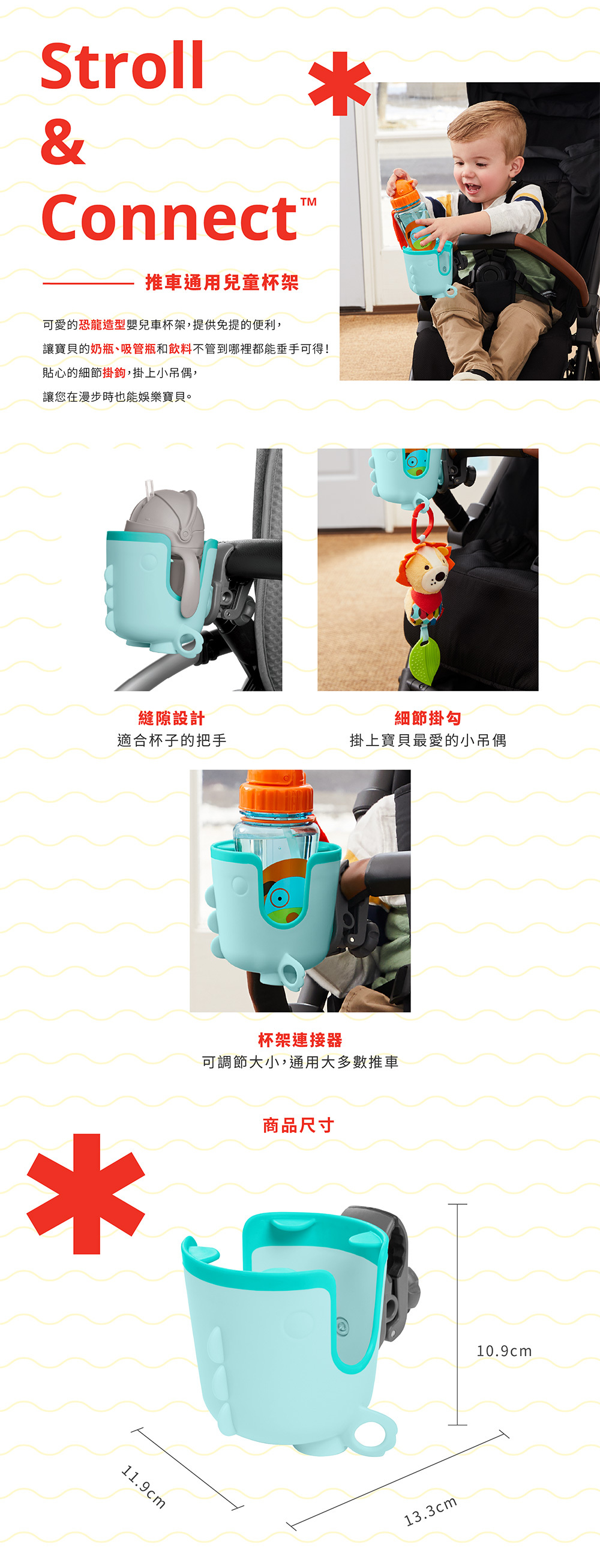 -杯架兩側皆附掛鉤,可掛寶貝喜愛的小吊偶玩具