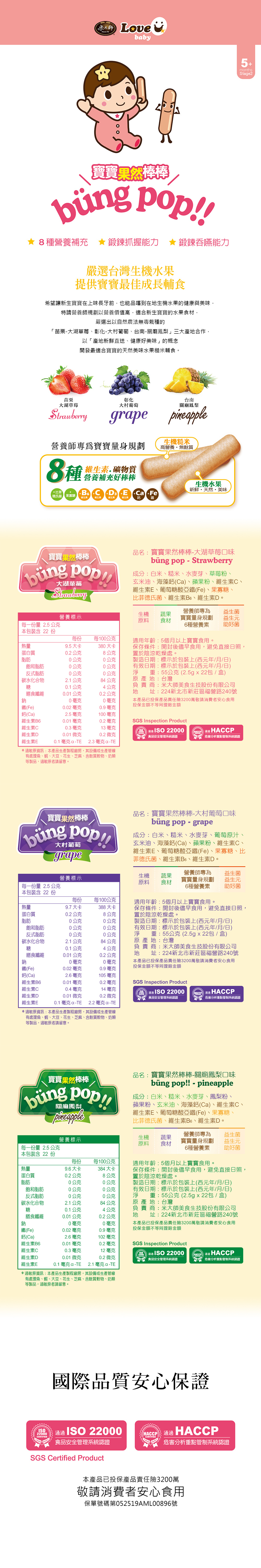 草莓口味成分:白米、糙米、水麥芽、草莓粉、玄米油、海藻鈣(Ca)、蘋果粉、維生素C、維生素E、葡萄糖酸亞鐵(Fe)、果寡糖、比菲德氏菌、維生素B6、維生素D。