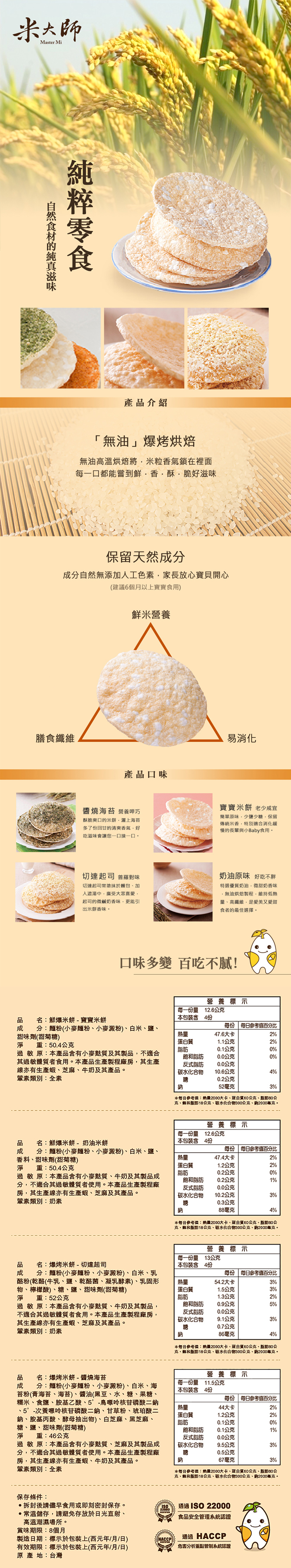 奶油口味成分:麵粉、白米、奶油香料、糖、鹽、甜菊糖(天然植物萃取)