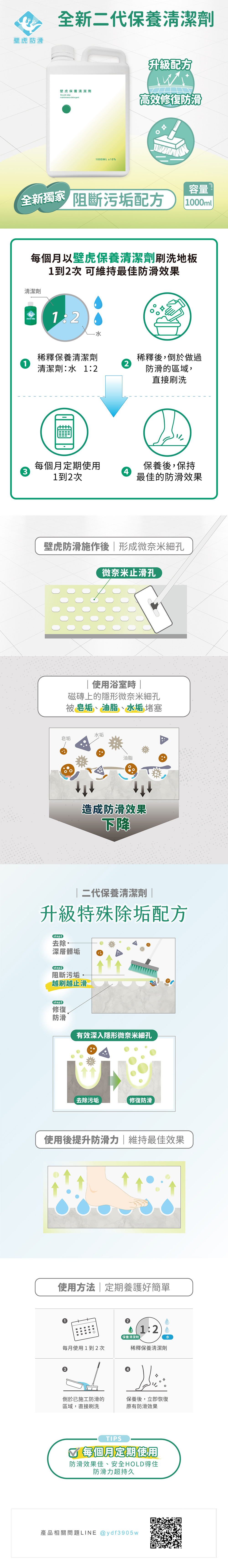 壁虎防滑二代組(需搭配專用平板工具施工):可維持三年以上,請務必每個月使用專用保養清潔劑刷洗養護。