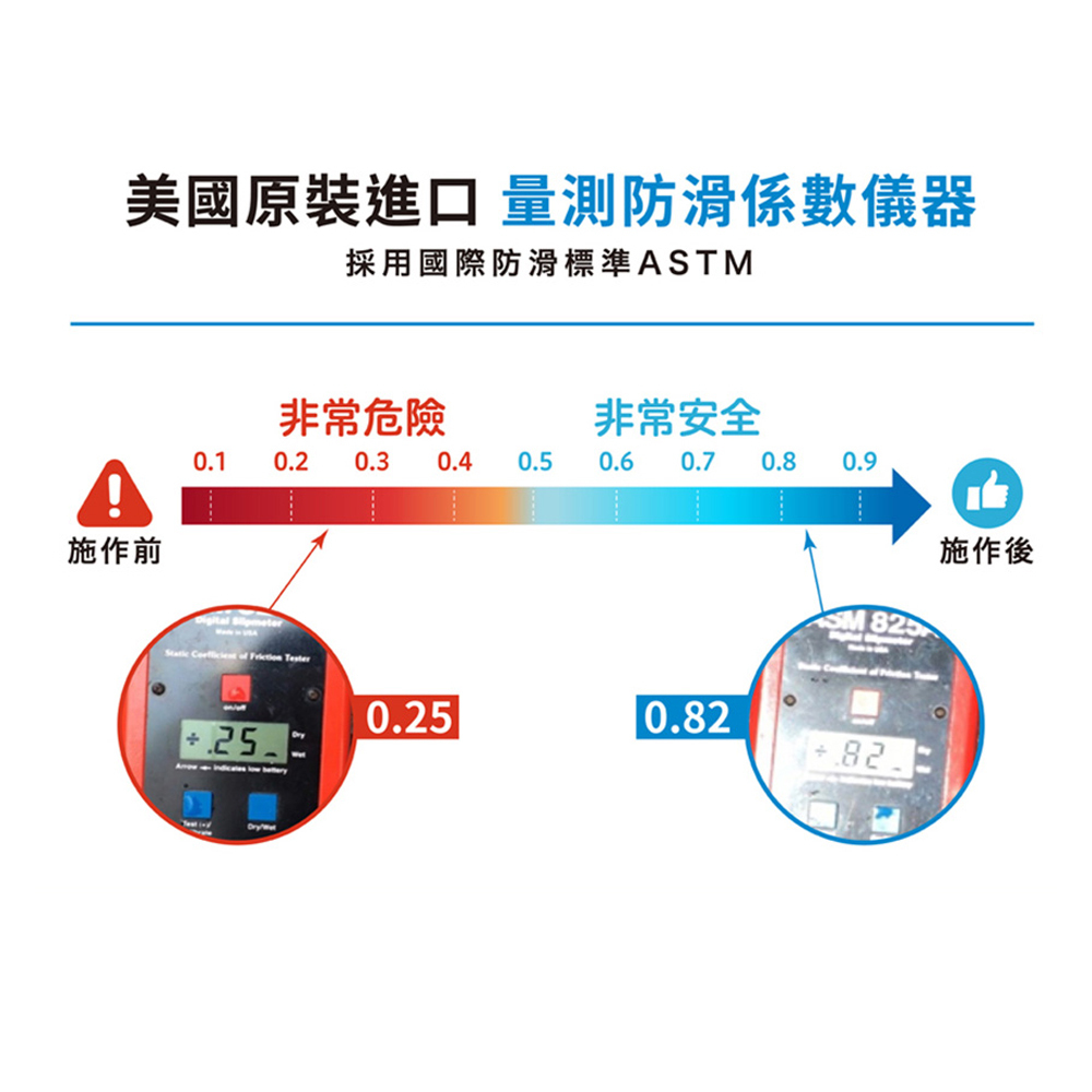 A4:現有防滑磁磚以粗面材質增加摩擦力,但排水不易,遇水還是相當濕滑,使用壁虎防滑劑施工後,磁磚可達國際ASTM防滑係數「非常安全」標準之上,所以即使是防滑磁磚,建議仍可施工,雙重保護加倍安全。