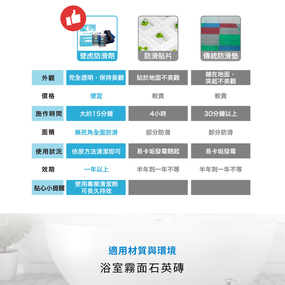 壁虎防滑二代組(需搭配專用平板工具施工):可維持三年以上,請務必每個月使用專用保養清潔劑刷洗養護。