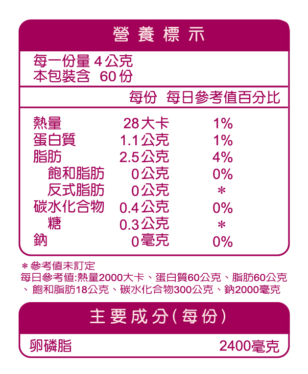 -精純卵磷脂來源,每包含2,400毫克精純卵磷脂,更添加珍貴金絲燕燕窩,草莓風味口感極佳,讓哺乳好順利!