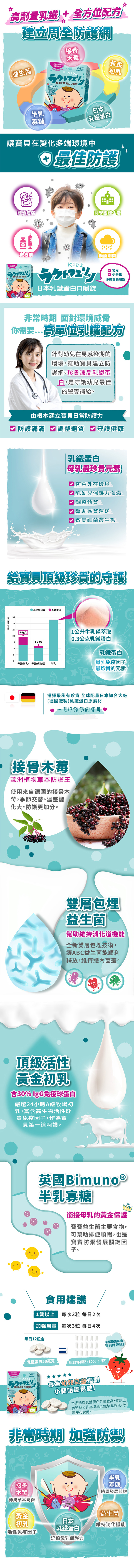 -嚴選日本乳鐵蛋白、接骨木莓萃取物、黃金初乳IgG、包埋益生菌及專利半乳寡糖,每日量含高單位乳鐵蛋白50毫克,非常時期、建立周全防護網的兒童乳鐵蛋白推薦首選。