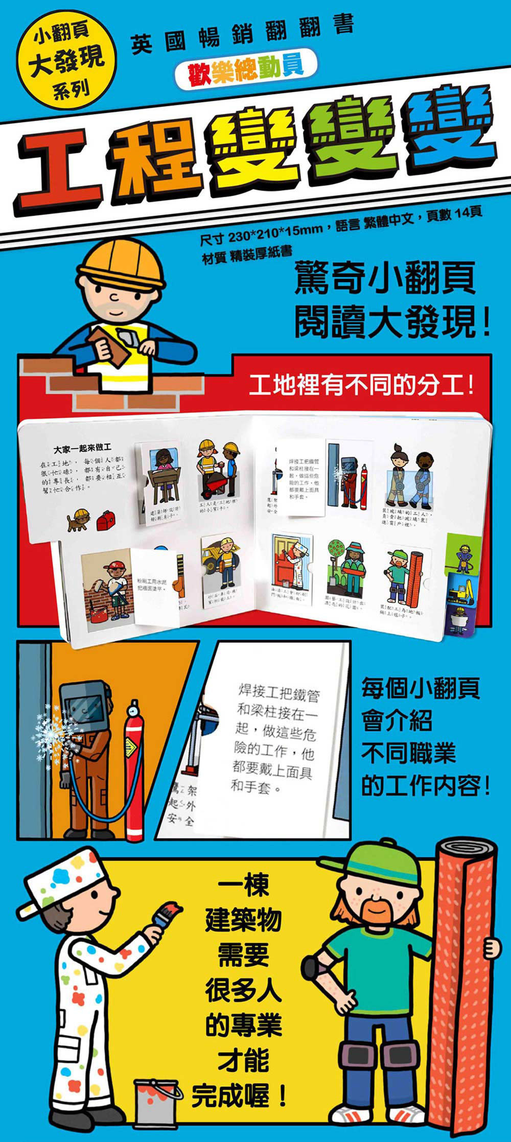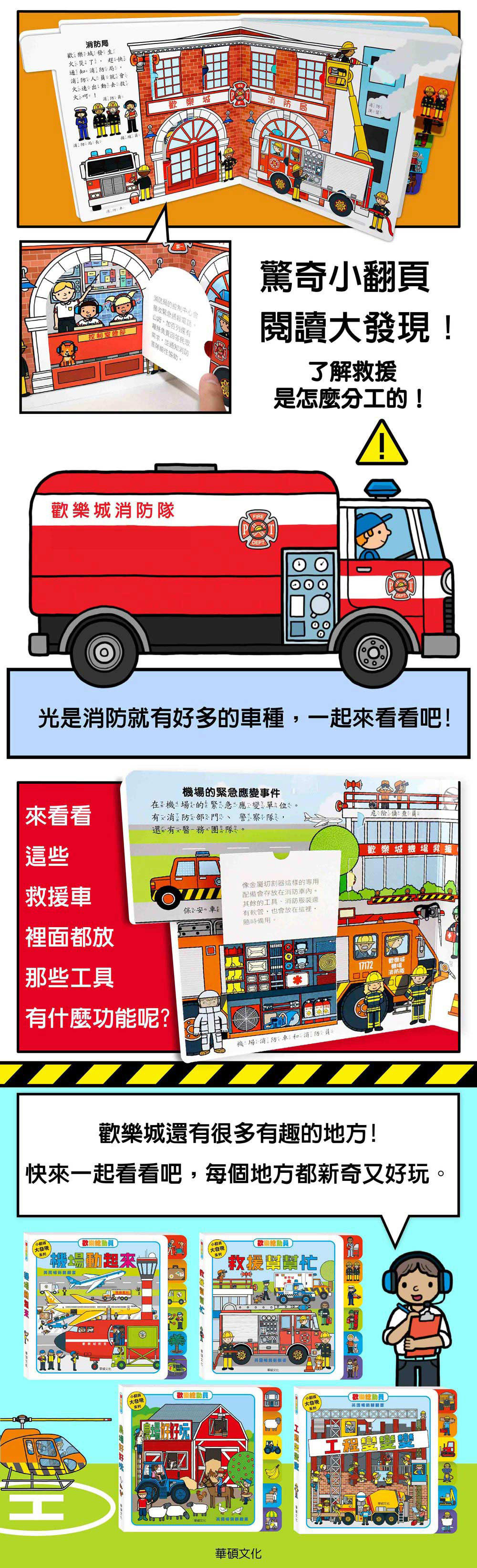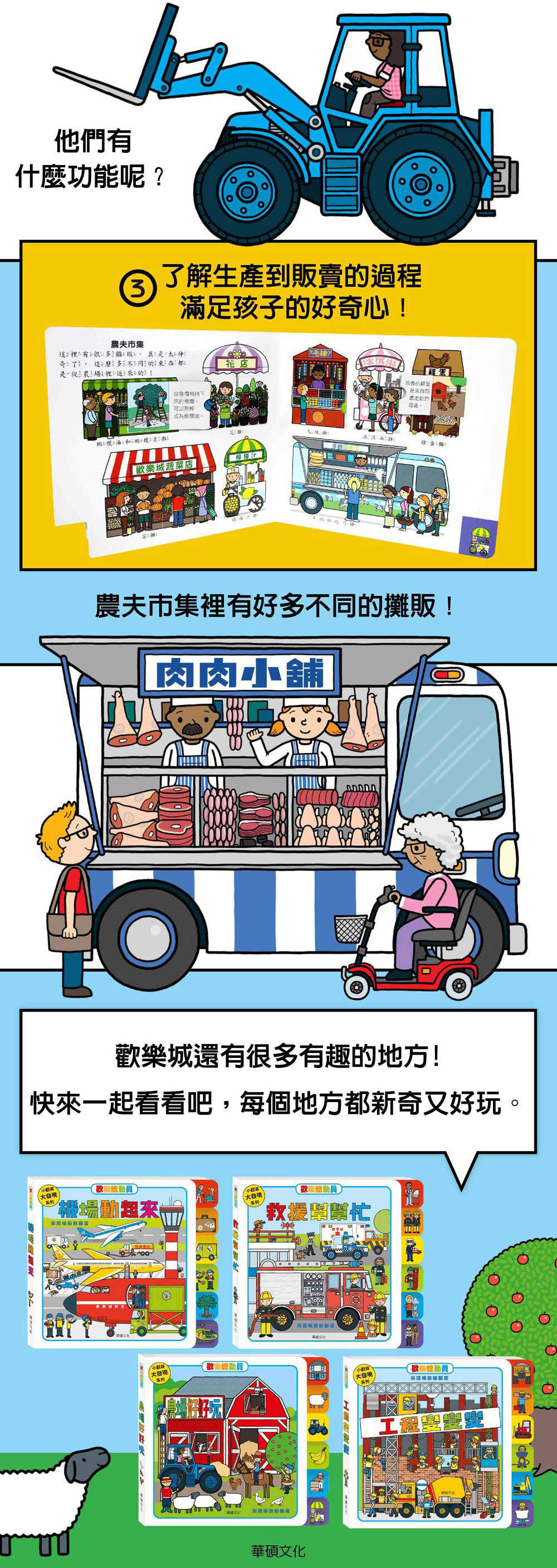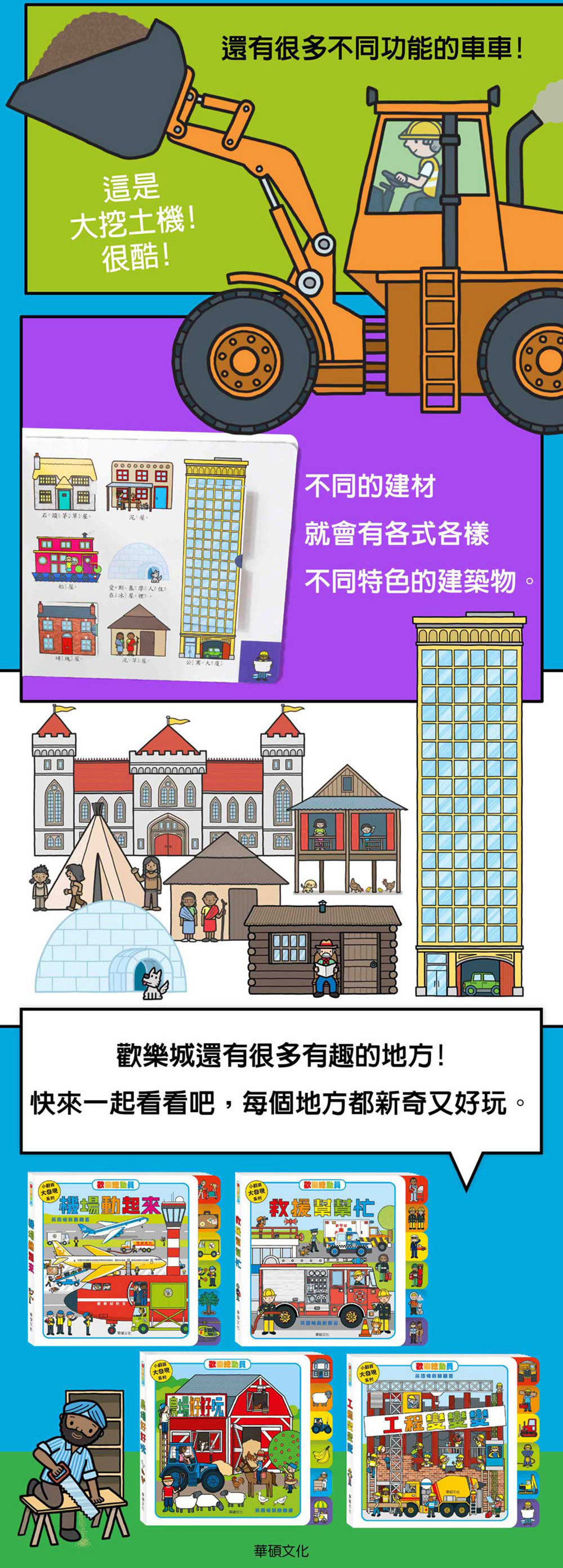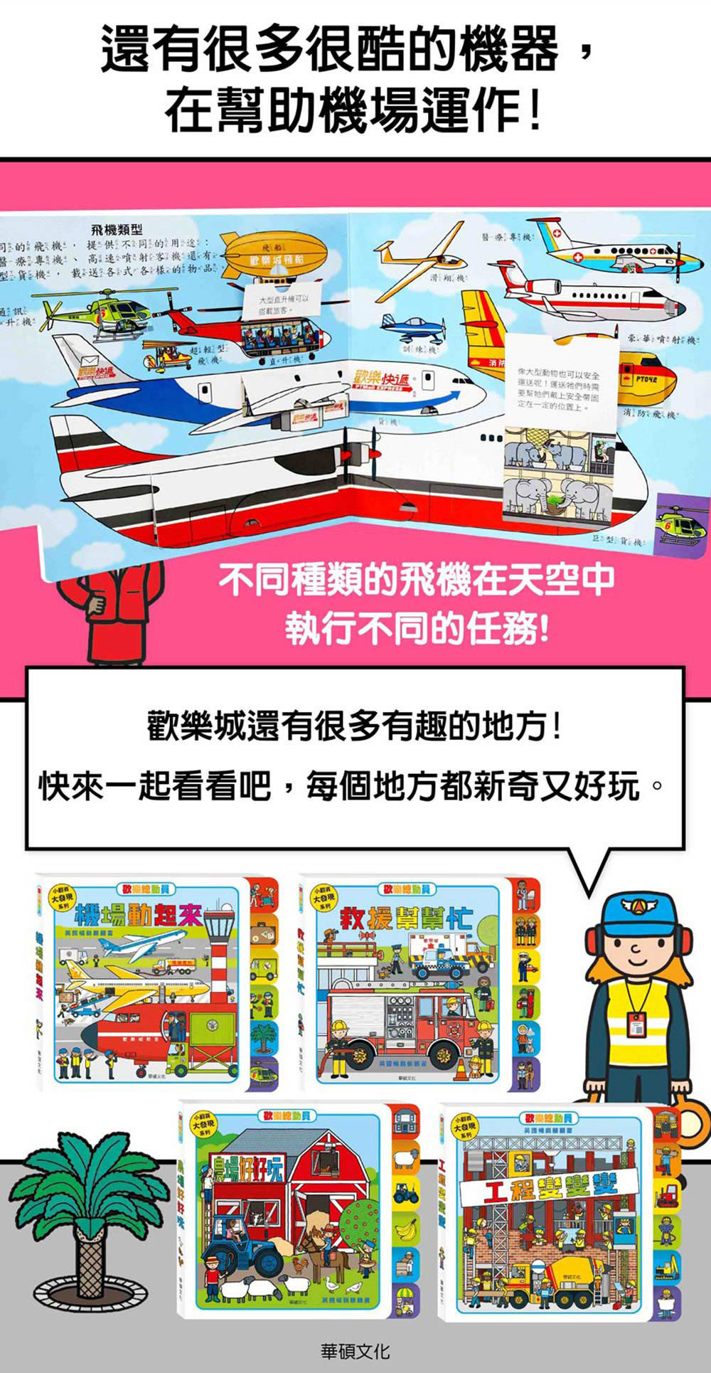 -行行出狀元,從書中瞭解各式各樣的職業,相關的交通工具或機器設備。