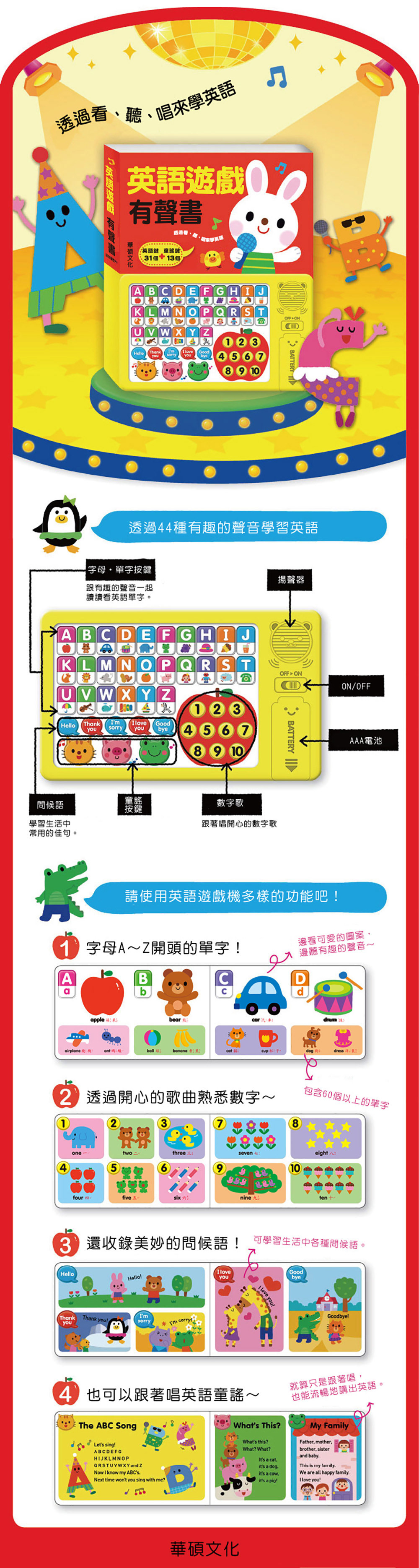 -44種有趣的聲音(包含26個字母、3首童謠、5個問候語和10個數字按鍵)